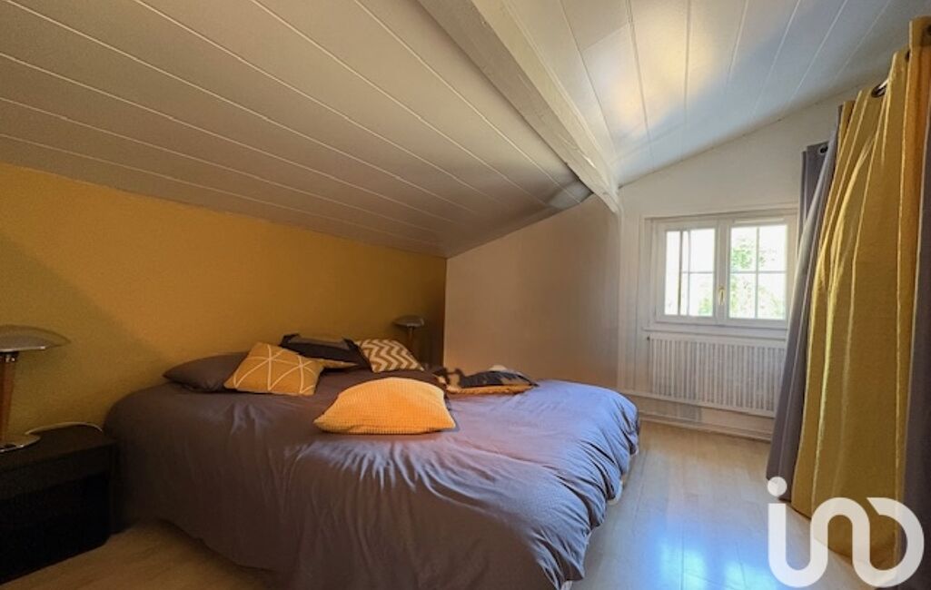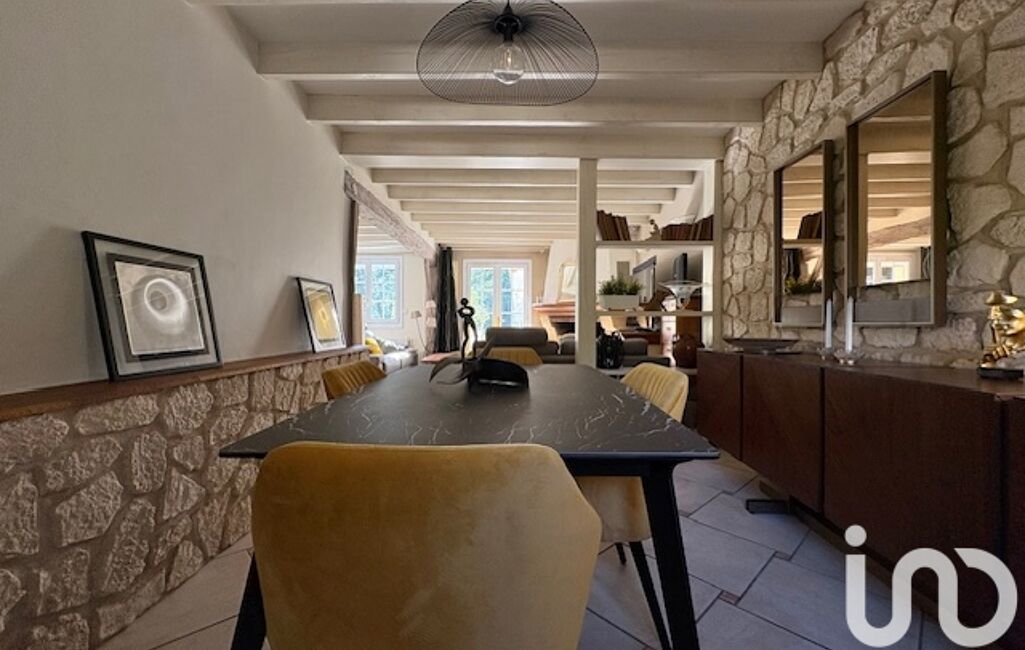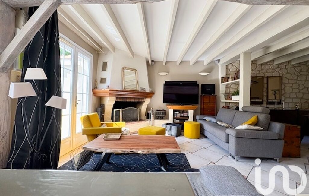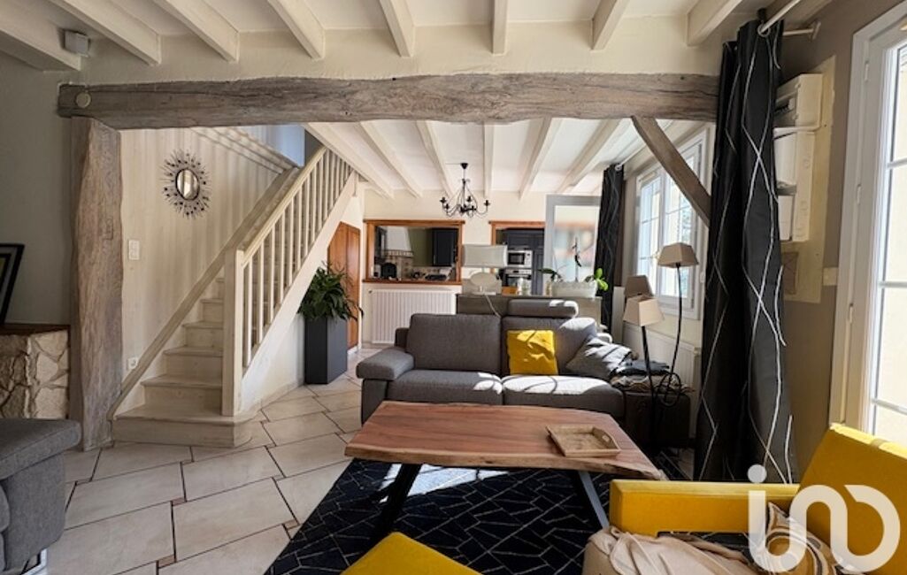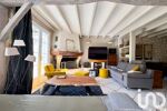 Une maison principale de 145 m² avec une pièce de vie lumineuse, poutres apparentes, mur en pierres, cheminée, chambres mansardées authentiques.