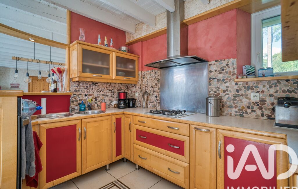 La maison principale (202m2 carrez ) se compose au rez-de-chaussée d'une entrée avec placard et WC, d'un séjour ( 50m2 ) avec poêle à bois et cuisine aménagée et équipée, qui donne accès à une terrasse sur pilotis et d'une buanderie chaufferie.