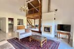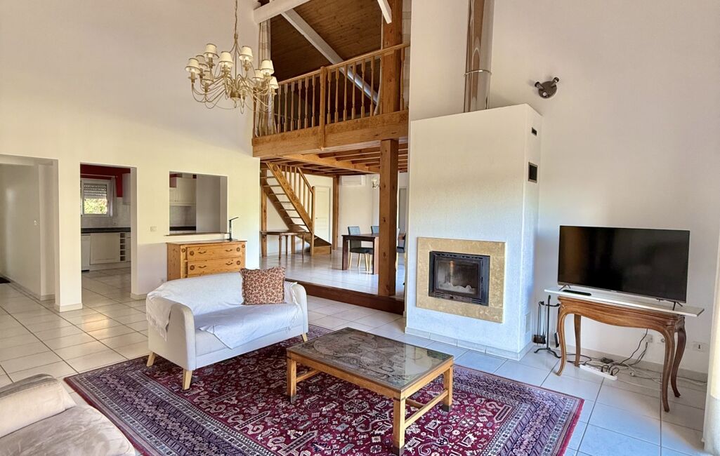 Elle se compose d’une entrée avec placard, d’un séjour lumineux sous plafond cathédrale avec cheminée, d’une cuisine semi-séparée entièrement équipée, de 3 chambres, de 2 salles de bains, d’un cellier, d’une buanderie et de 2 WC.