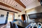 Dans cette salle à manger, une cheminée majestueuse en pierres de taille, sublimée par un manteau travaillé, vient magnifier l’espace et renforcer la noblesse des lieux.