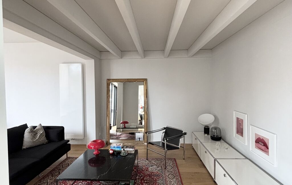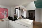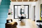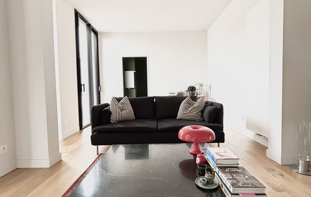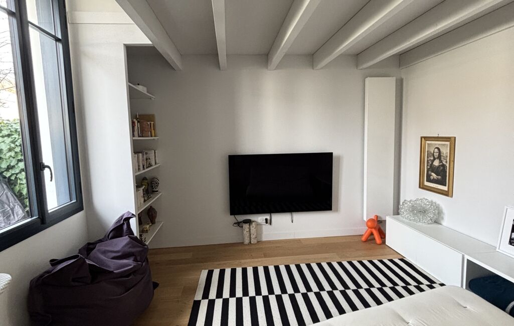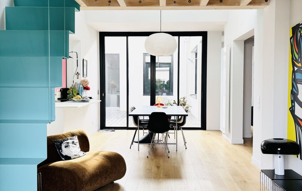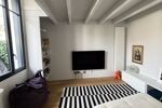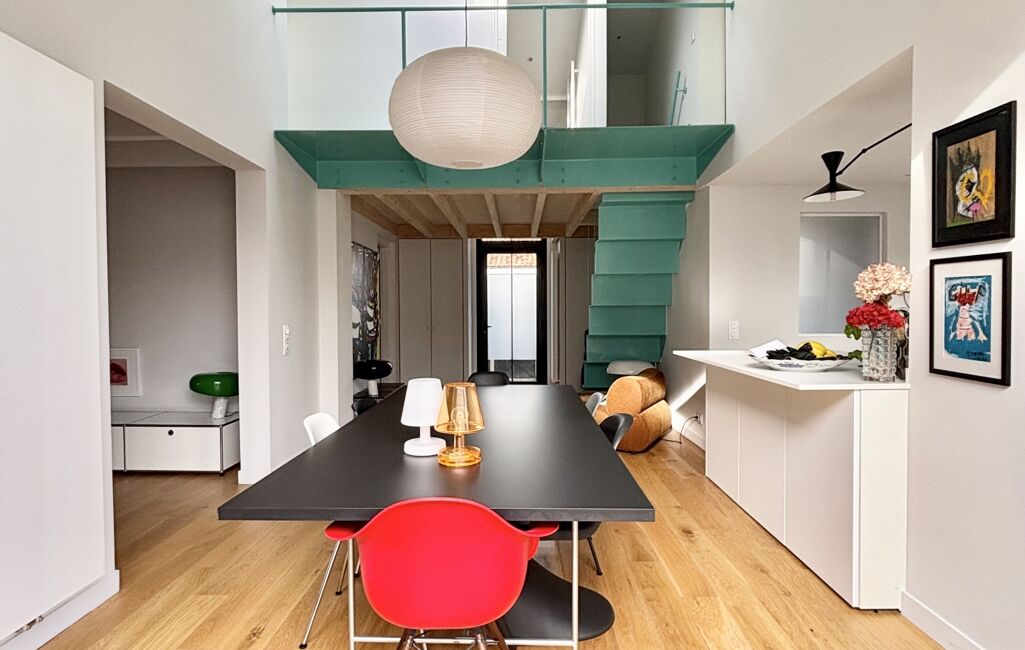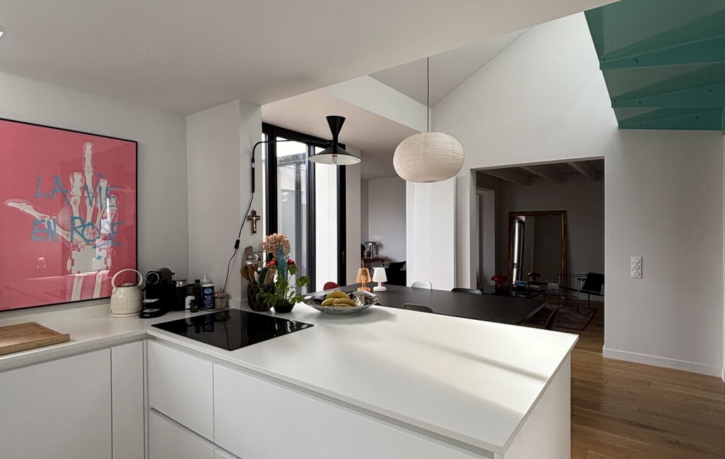 Elle se compose au rez de chaussée d'un double séjour exposé Sud avec une grande hauteur sous plafond dont les ouvertures généreuses donnent sur la terrasse, d'une cuisine neuve et équipée, ouverte sur la pièce à vivre.