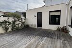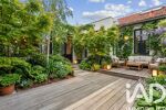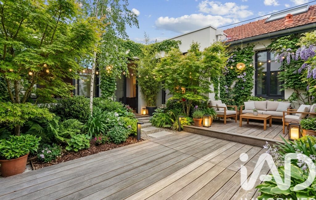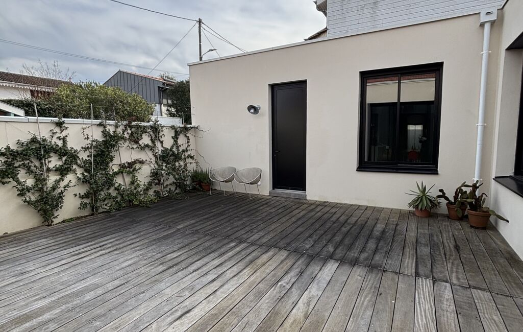 Le jardin de ville de 50m2, piscinable, aménagé en terrasse bois, est parfait pour des repas en extérieur ou des moments de détente en famille.