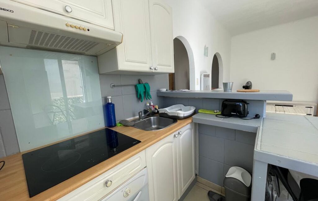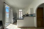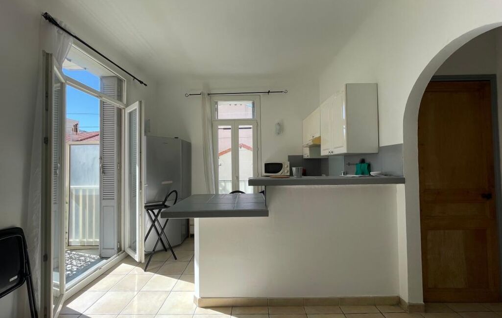 Un séjour-cuisine moderne, entièrement équipé, ouvrant sur un balcon