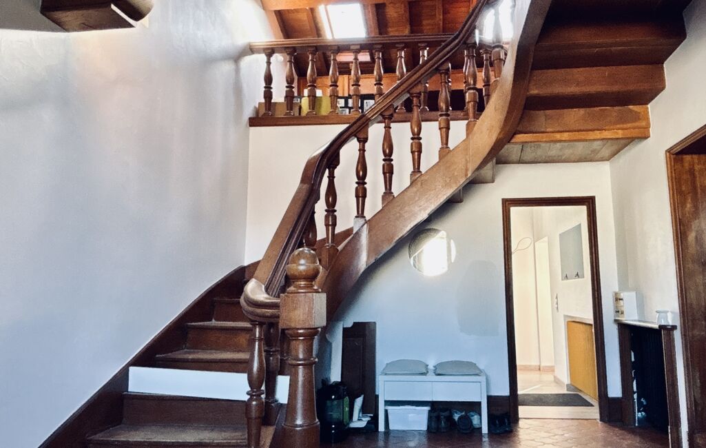 L’étage se développe au sein de la tour, où prennent place deux chambres lumineuses, chacune profitant du caractère unique de cette architecture ancienne. À l’étage supérieur de cette même tour, un dortoir chaleureux sous combles, mis en valeur par sa charpente apparente, offre un espace idéal pour accueillir famille, enfants ou invités. Plusieurs mezzanines, recoins et zones de rangement renforcent le charme irrationnel de cette partie nuit, tandis que l’ensemble s’articule autour d’un escalier monumental en bois, véritable pièce maîtresse de la maison.