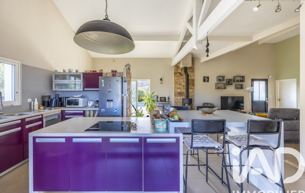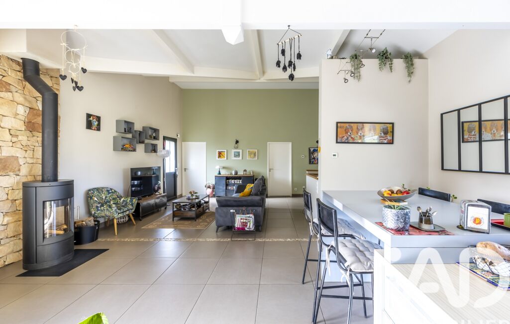 La partie habitable est entièrement de plain-pied, avec une belle pièce de vie baignée de lumière, ses hauts plafonds et poutres apparentes, chaleureuse avec son poële à bois et ouverte sur une cuisine moderne et fonctionnelle.