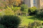 Jardin entouré d'un joli mur en pierre.