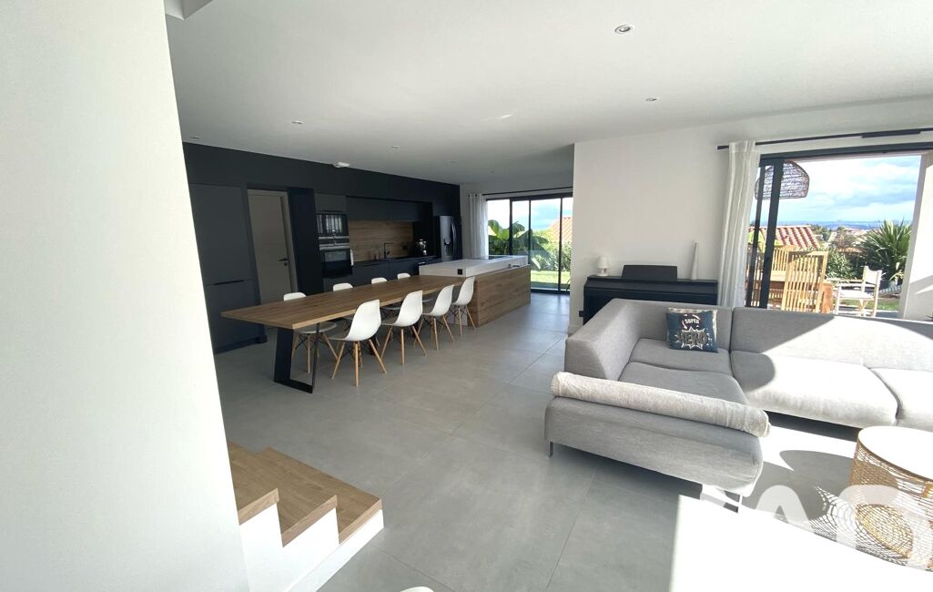 Quelques marches plus bas, l’espace de vie s’ouvre sur une superbe pièce à vivre baignée de lumière, sublimée par de larges baies vitrées à galandage.