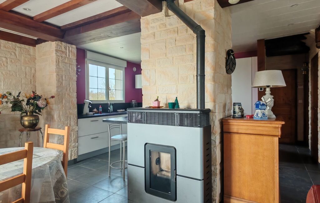 Dès l’entrée, le ton est donné : une atmosphère chaleureuse et contemporaine vous accueille. Vous découvrez une cuisine aménagée et équipée, moderne et fonctionnelle, pensée pour partager des moments conviviaux en famille ou entre amis. Elle s’ouvre harmonieusement sur un vaste séjour/salon baigné de lumière, sublimé par un poêle à granulés, véritable cOEur de la maison, et une pompe à chaleur assurant un confort optimal en toute saison.