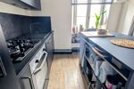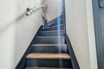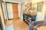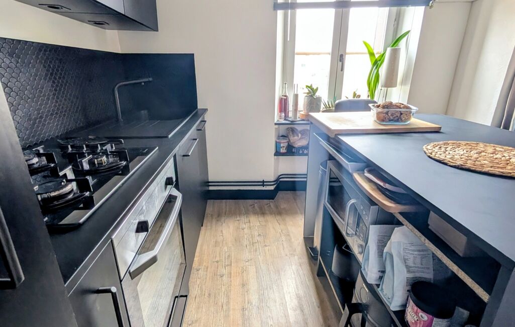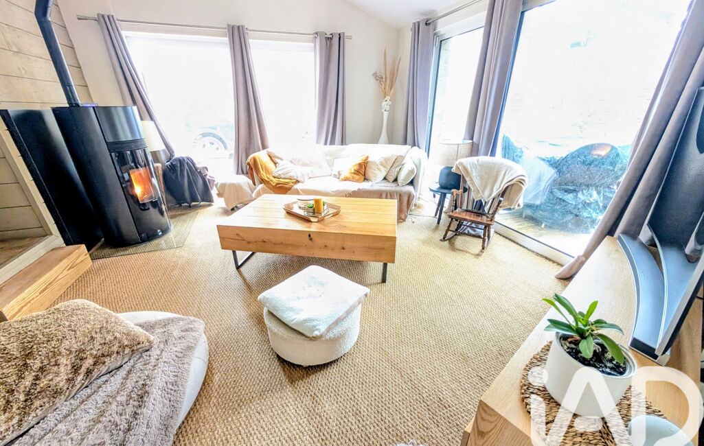 Belle pièce de vie chaleureuse avec poêle à granulés, cuisine moderne ouverte sur salle à manger, buanderie et WC séparé.
