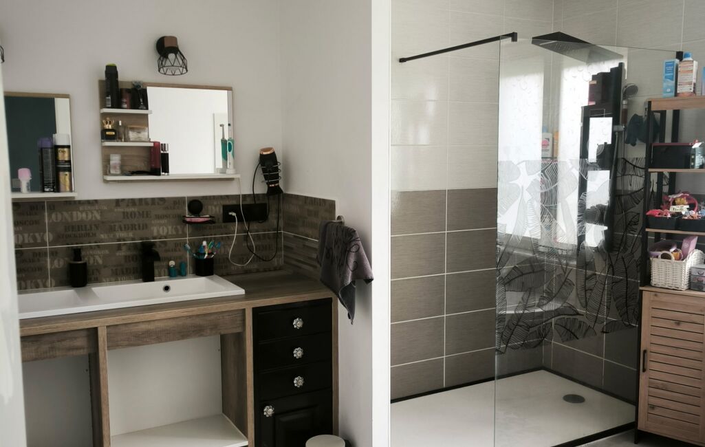 Le rez-de-chaussée dispose également d’un couloir de 11 m², d’un débarras attenant à la salle d’eau, d’une salle de bain et salle d’eau combinées de 15 m², ainsi que d’un WC indépendant. Deux chambres de 10 m² chacune complètent ce niveau, idéales pour enfants, invités ou bureau.