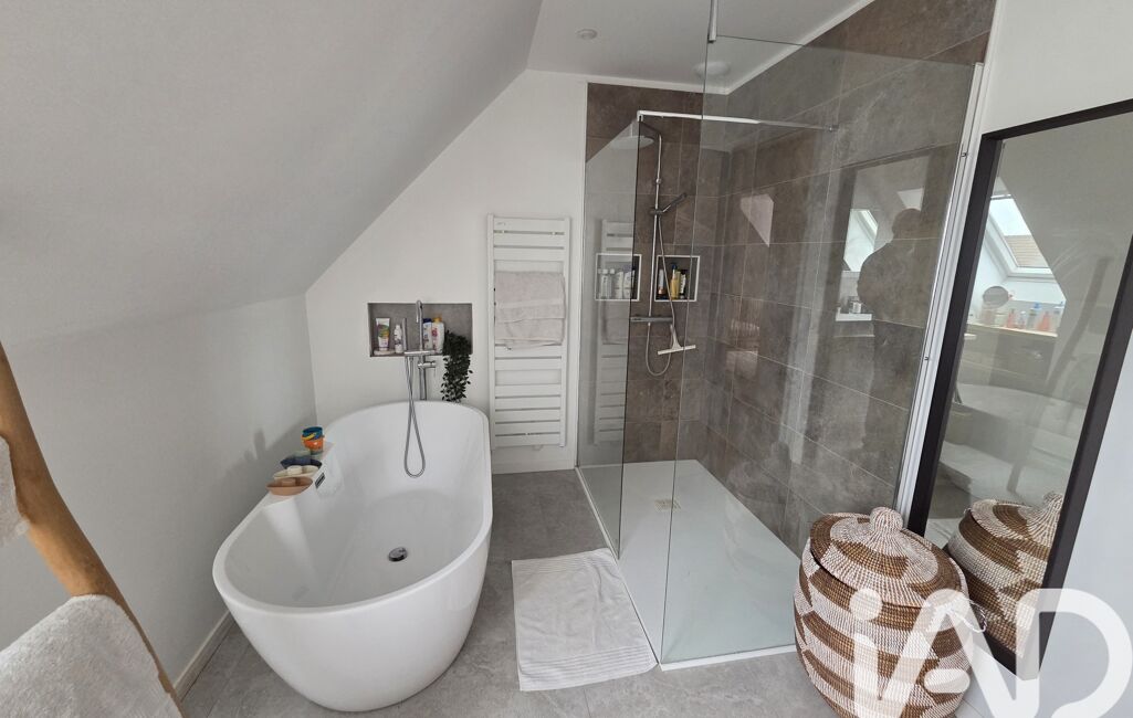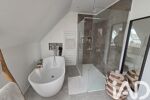 À l’étage, le palier dessert trois chambres de 12 m², ainsi qu’une salle de bain de 8 m² équipée d’une baignoire et d’une douche, et un second WC.