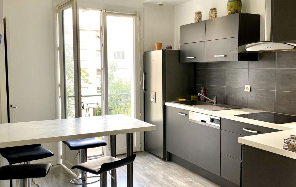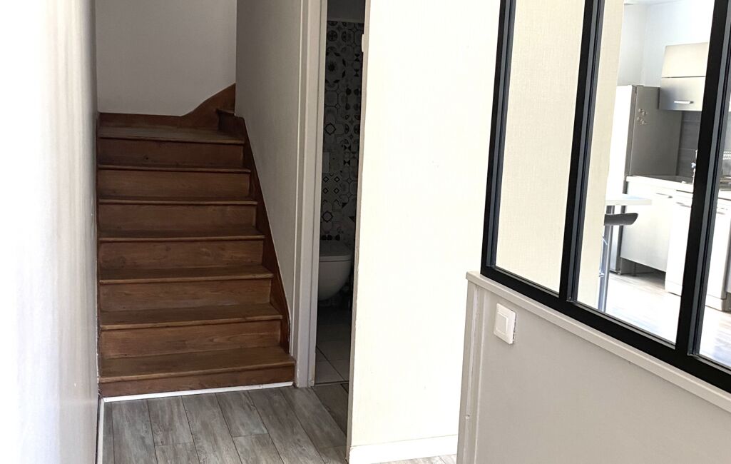-en rez de chaussée : entrée avec dégagement et WC. Une jolie verrière d’atelier ouvre sur l’espace cuisine/salle à manger. Depuis la cuisine, l’accès à un balcon qui permet d’aller au garage (même niveau) ou de descendre en rez de jardin, pour profiter de cet espace.