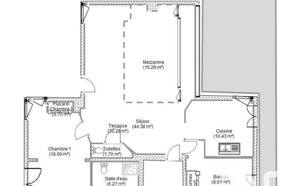 Un espace mezzanine accueille actuellement un espace nuit.