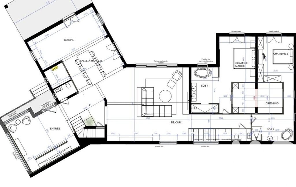 Dès l’entrée au rez-de-chaussée, un hall avec vestiaire s’ouvre sur une pièce de vie majestueuse aux proportions impressionnantes.