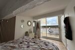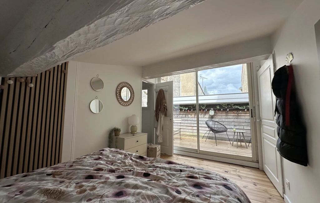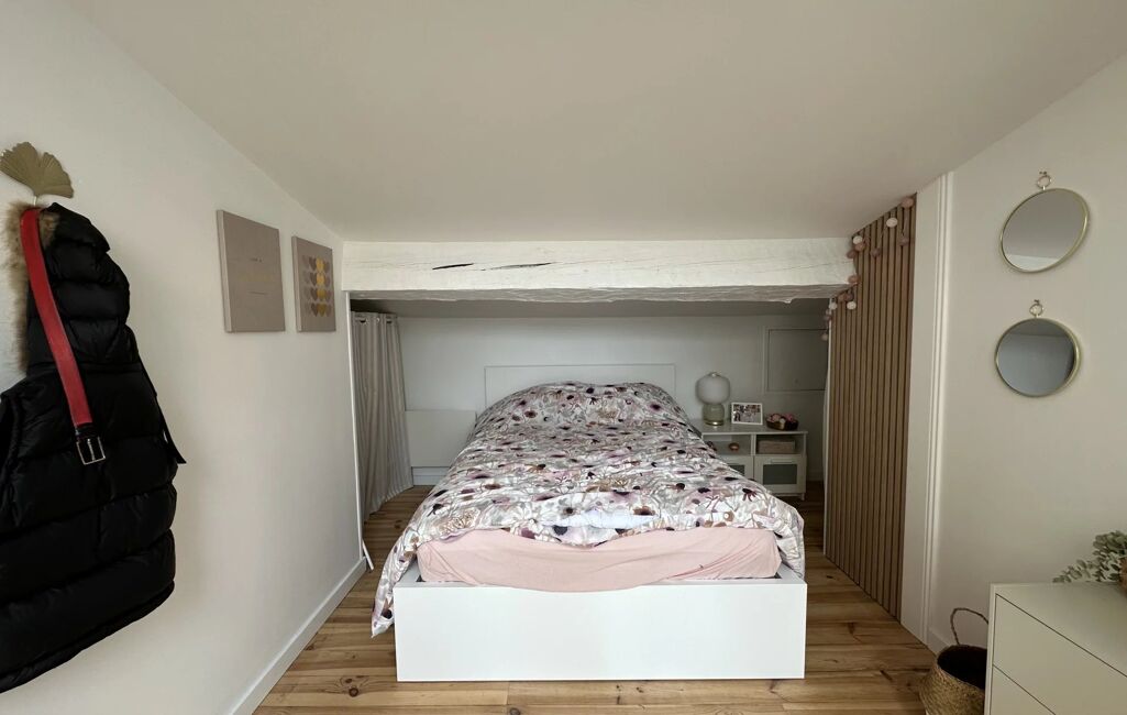 À l'étage, une deuxième grande chambre avec rangements, une salle d'eau avec WC et une grande terrasse accessible depuis le couloir ou depuis la chambre.