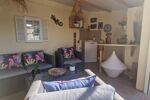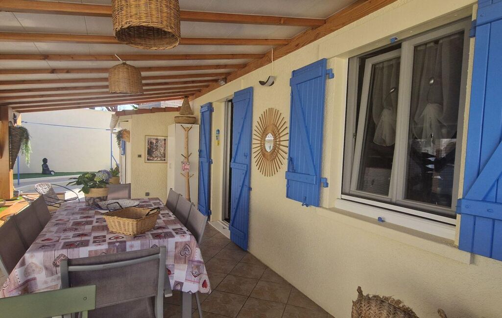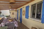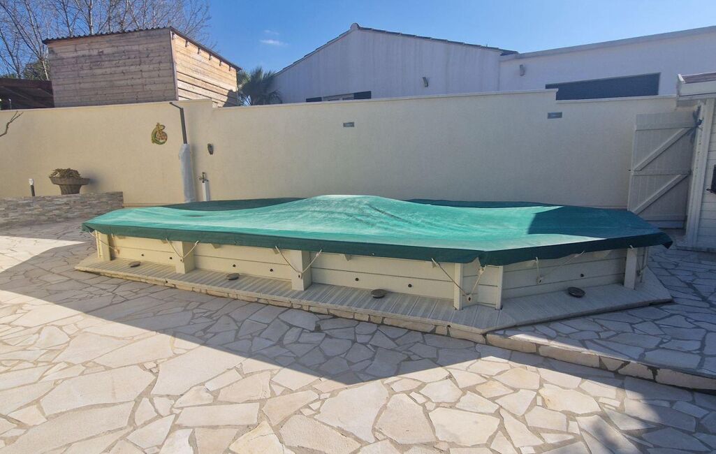 Une grande terrasse couverte pour les repas en extérieur, un espace détente et bains de soleil, deux coins salon de jardin, dont un abrité, une piscine semi-enterrée. La terrasse à l’avant de la maison, apporte un espace supplémentaire appréciable.