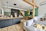 Dès le premier étage, vous découvrez une superbe pièce de vie baignée de lumière, sublimée par une belle hauteur sous plafond et des poutres apparentes qui lui confèrent un cachet chaleureux. La cuisine, aménagée et équipée, s’ouvre harmonieusement sur l’espace de vie. Deux chambres ainsi qu’une salle d’eau avec WC complètent ce niveau.