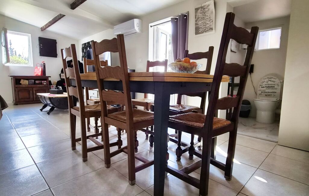 Un mobil home est également vendu avec la maison. Également un coin repas extérieur avec la terrasse attenante à la maison et au mobil home.