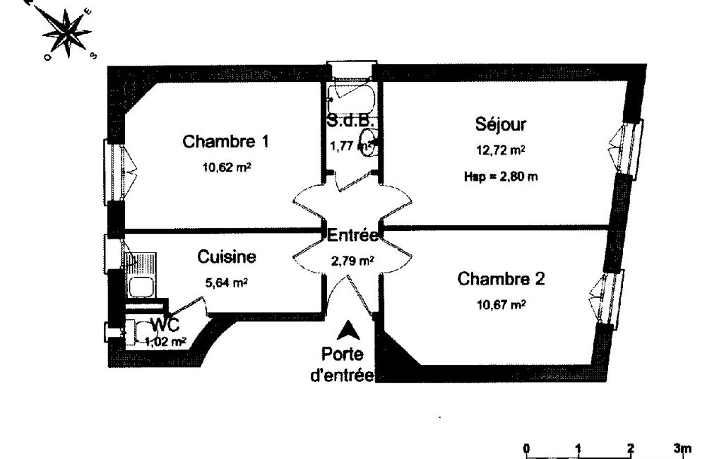 Distribution optimale en étoile : 1 séjour, 2 chambres, 1 entrée, 1 salle d'eau, 1 cuisine, 1 WC séparé.
