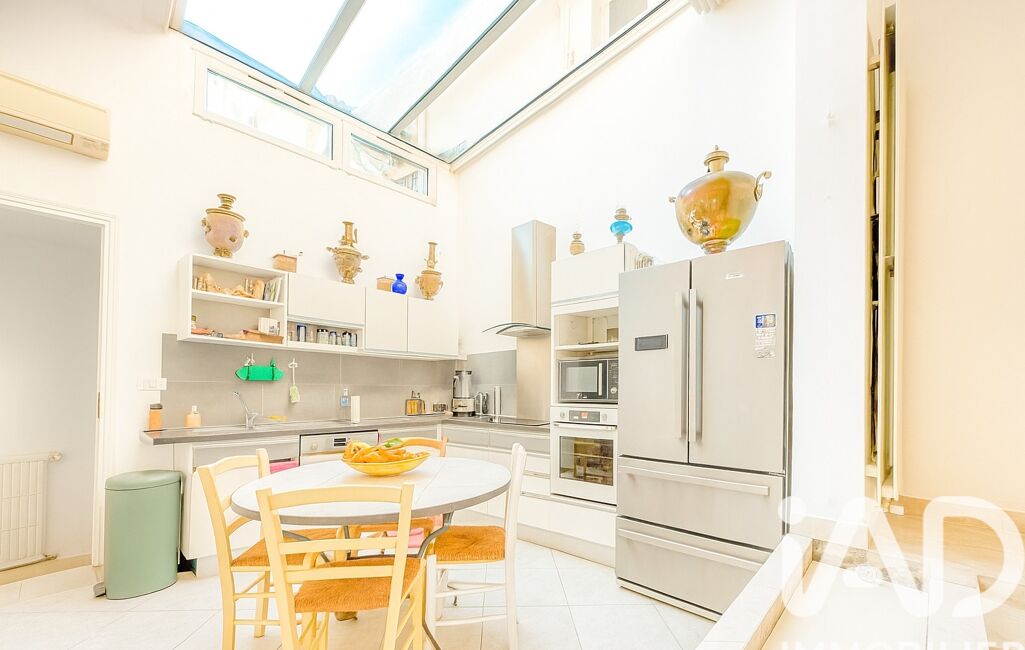 La cuisine ouverte, entièrement équipée, s’intègre harmonieusement à l’espace de vie, offrant une atmosphère conviviale et chaleureuse baignée de lumière grâce à une verrière en plafond qui créer un puits de lumière apportant une belle luminosité naturelle à la pièce.