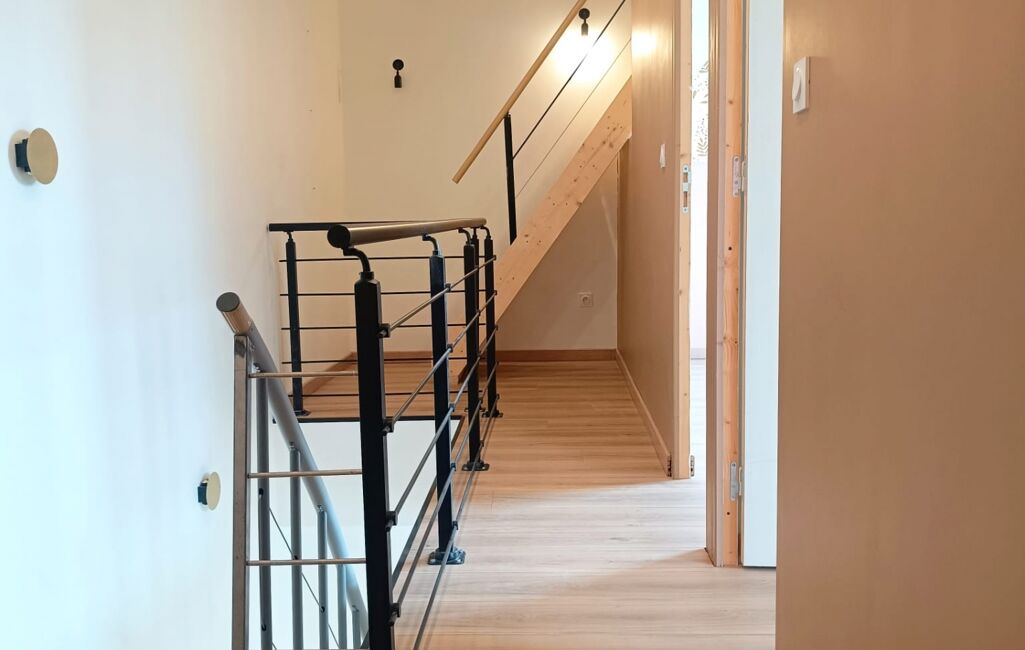 Au RDC, vous trouverez une belle pièce de vie de 43m2 avec une cuisine neuve et un bel espace baigné de lumière en parquet chevron donnant sur une petite terrasse pour des déjeuners face à la nature.