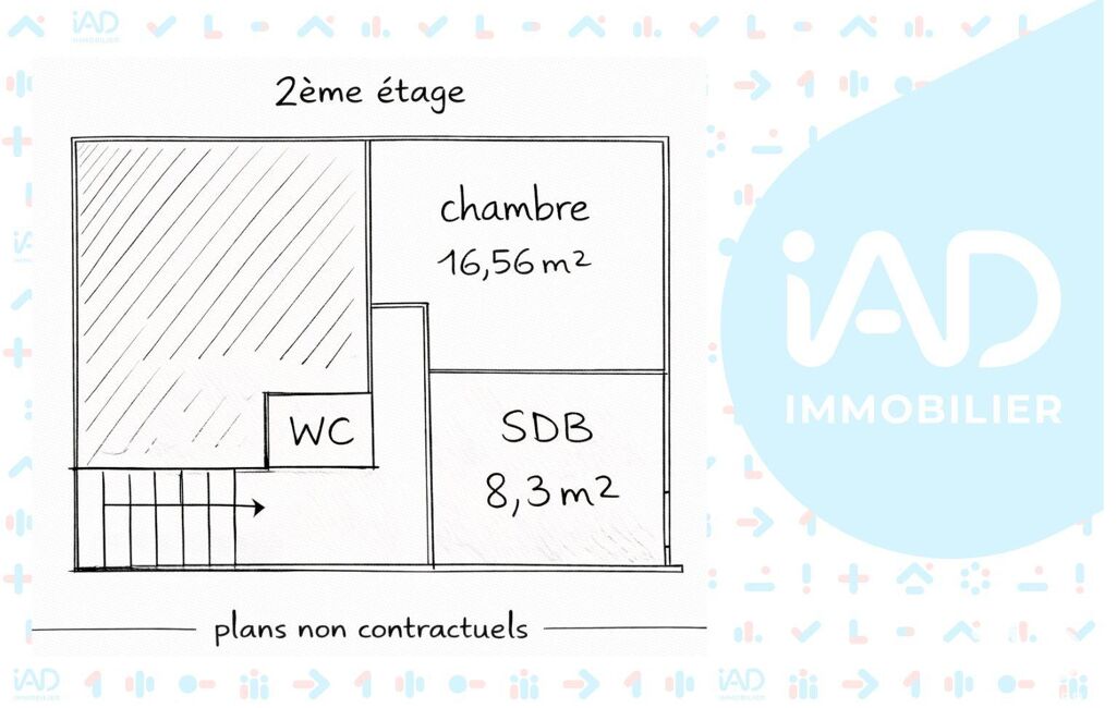 Au deuxième étage : une chambre de 16,50 m² environ, une salle de bains de 8,30 m² environ et un WC indépendant.