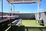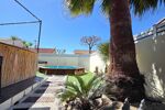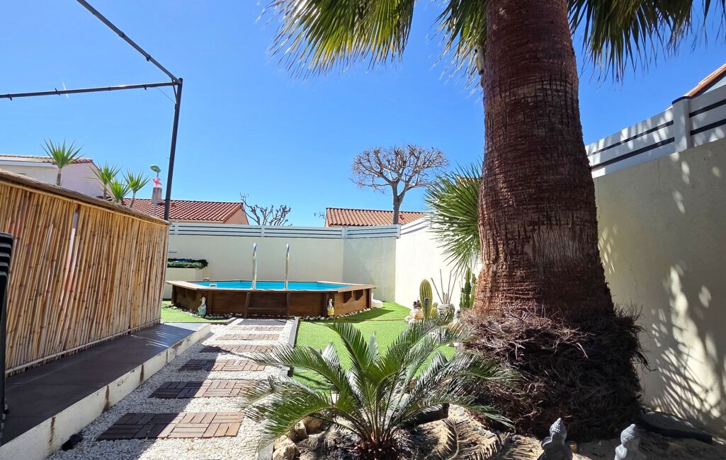 Pour la partie jardin, deux terrasses carrelées, gazon synthétique et piscine semis enterré, annexe pour stockage.