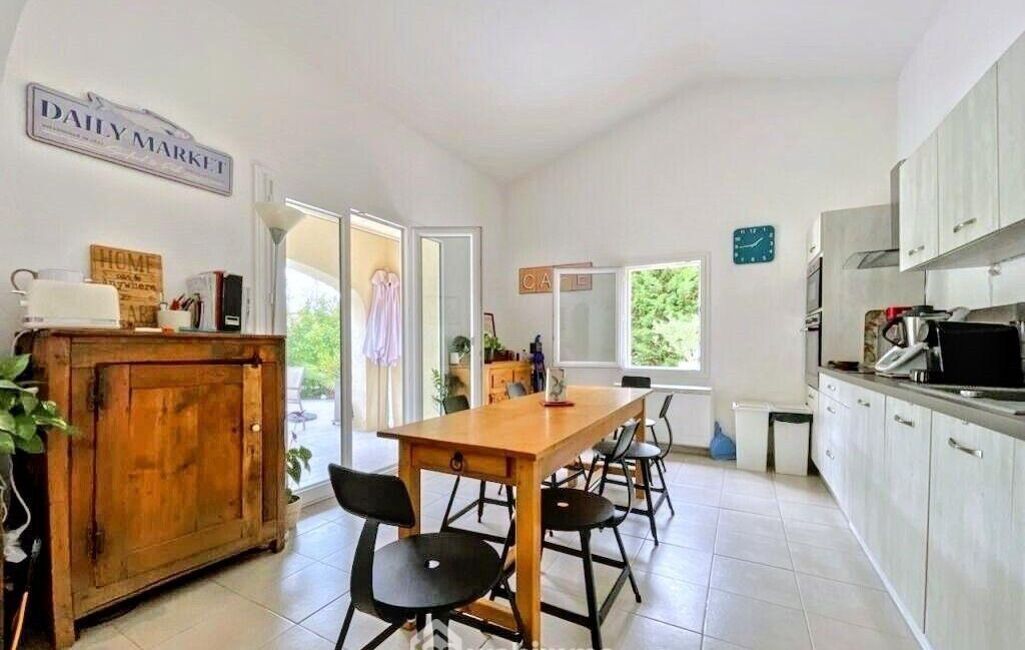 La villa se compose d'une entrée accueillante, d'un vaste séjour lumineux avec cheminée insert et espace salle à manger, d'une cuisine ouverte entièrement équipée, d'une buanderie indépendante, d'une salle de bains, de WC séparés et de trois chambres de plain-pied.