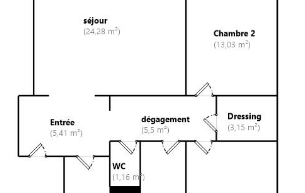 Une entrée, une cuisine séparée avec un espace cellier, un grand salon exposé sud avec balcon filant, un couloir avec de grands placards de rangements, un WC séparé, 2 belles chambres (dont une avec accès au balcon) et une salle d’eau.
