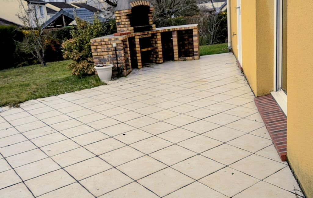 Garage carrelé avec porte motorisée et une cuisine d'été avec porte de service sur la terrasse.