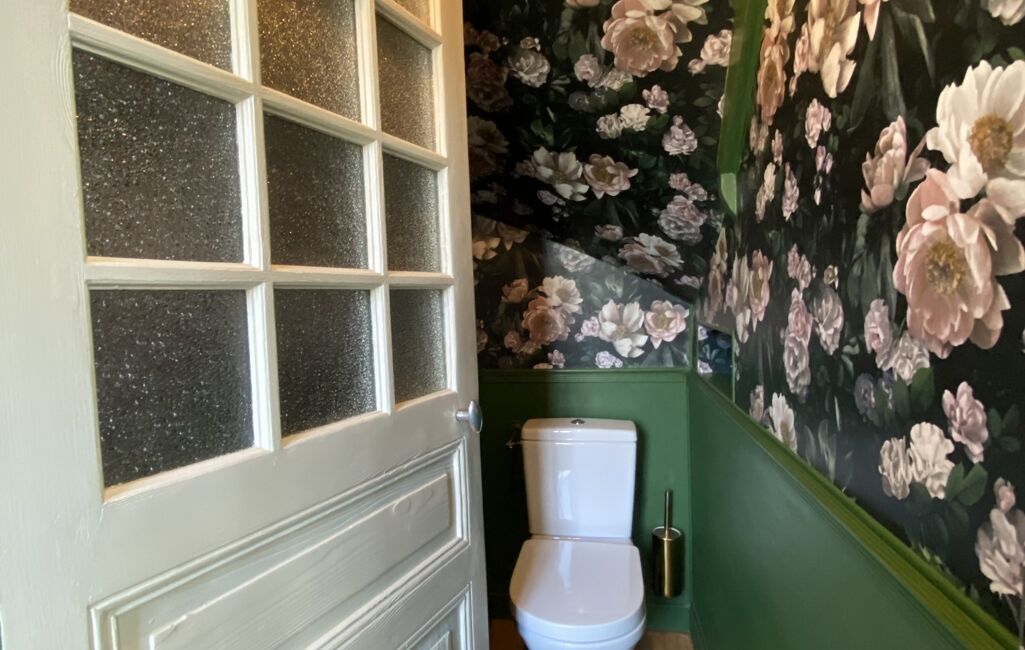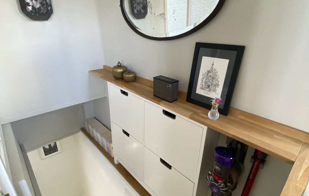 En niveau inférieur, un salon cosy complète l’espace de vie, ainsi qu’une salle de bain avec buanderie et chaufferie.
