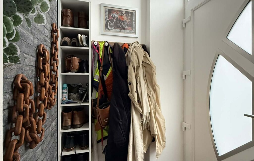 Une seconde entrée mène directement au jardin où vous profitez d’une terrasse couverte, d’une pergola avec vitrages supérieurs coulissants, d’un appentis, d’un cabanon servant d’atelier et d’une réserve d’eau. Un espace extérieur agréable etfacile à vivre au quotidien.