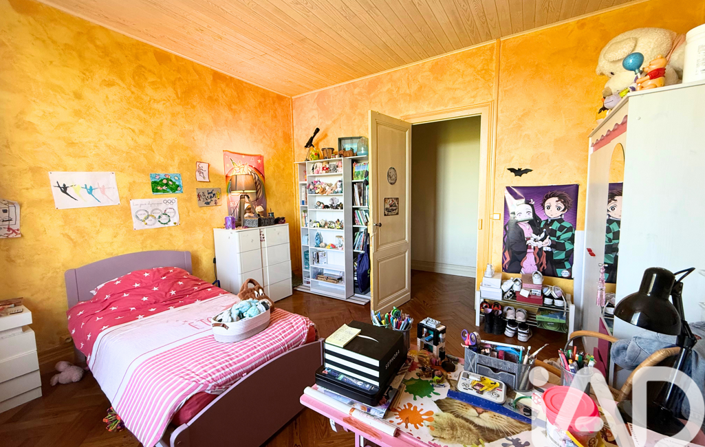 À l’étage, le palier, agrémenté de vitraux et desservi par un bel escalier en bois, distribue trois chambres, un WC et un espace de rangement.