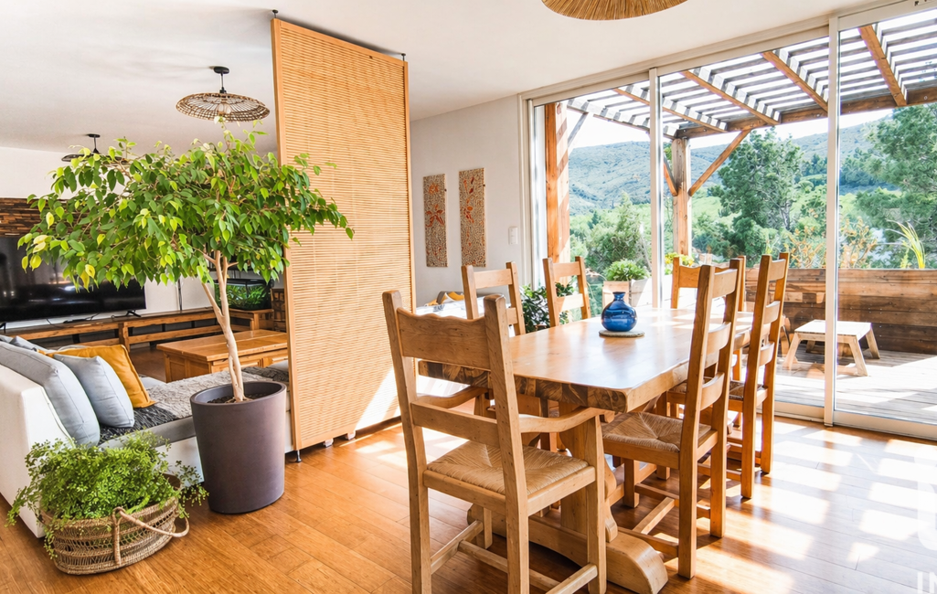 Un poêle à bois vient renforcer l’atmosphère cocooning. Tout cet ensemble se prolonge naturellement vers la terrasse, offrant une vraie continuité entre intérieur et extérieur.