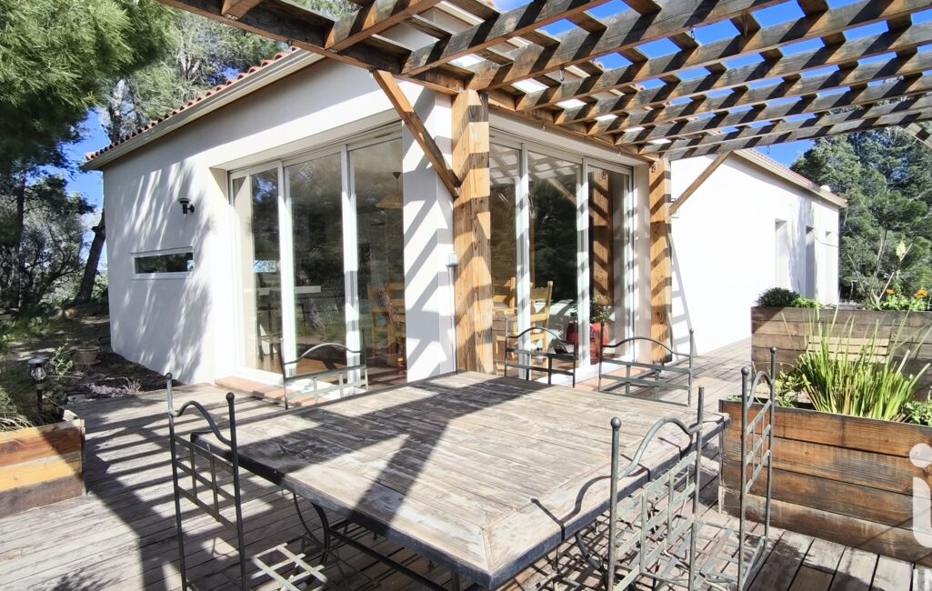 À l’extérieur, la grande terrasse bois avec pergola devient une véritable pièce de vie aux beaux jours : repas face à la nature environnante, moments de détente, soirées entre amis… Ici, on respire, on se détend. Le terrain piscinable offre encore de belles possibilités d’aménagement.