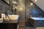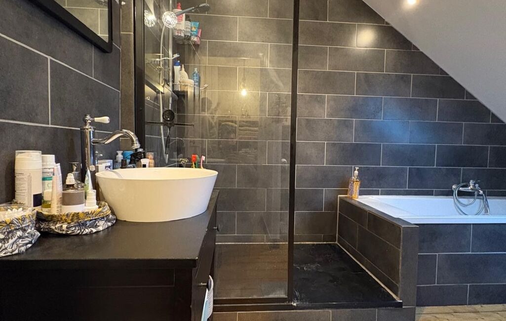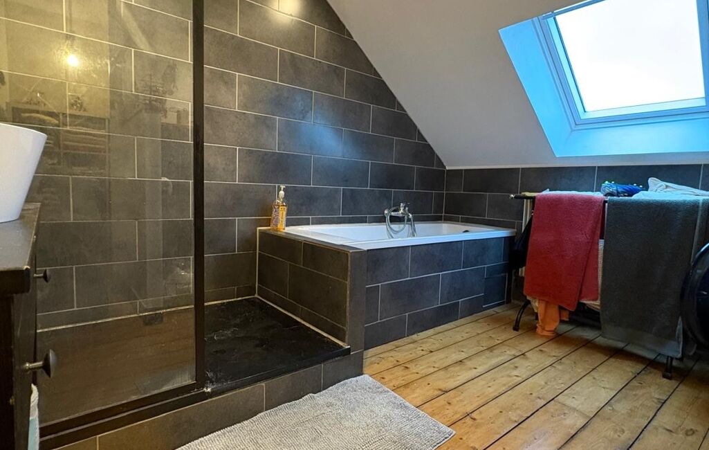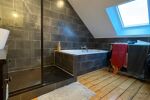 Au deuxième étage palier desservant une salle de bain avec douche, baignoire et sanitaire.