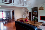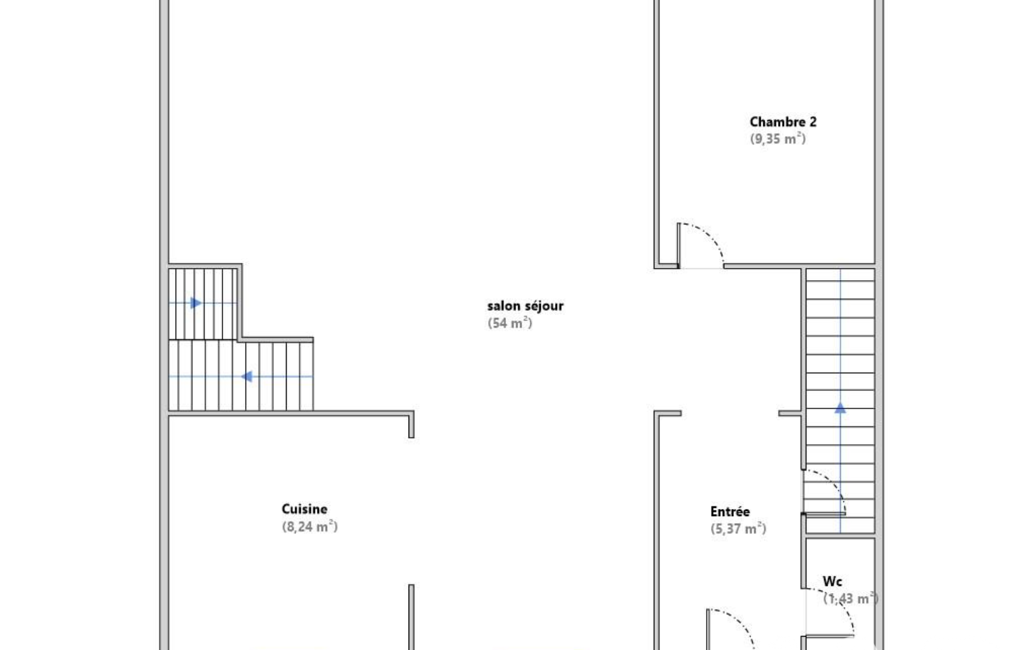 Le rez-de-chaussée sur-élevé s'articule autour d'un spectaculaire séjour cathédrale traversant de 54 m² ouvert sur terrasse et jardin, complété d'une cuisine américaine aménagée, d'une chambre/bureau et d'un WC.