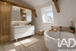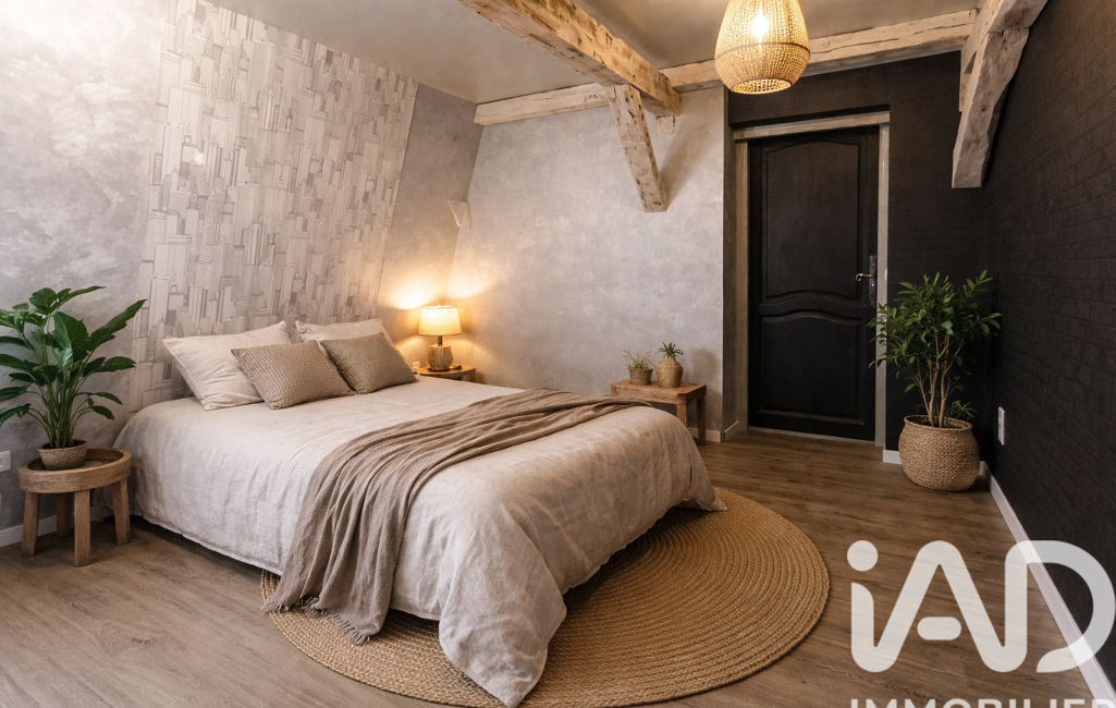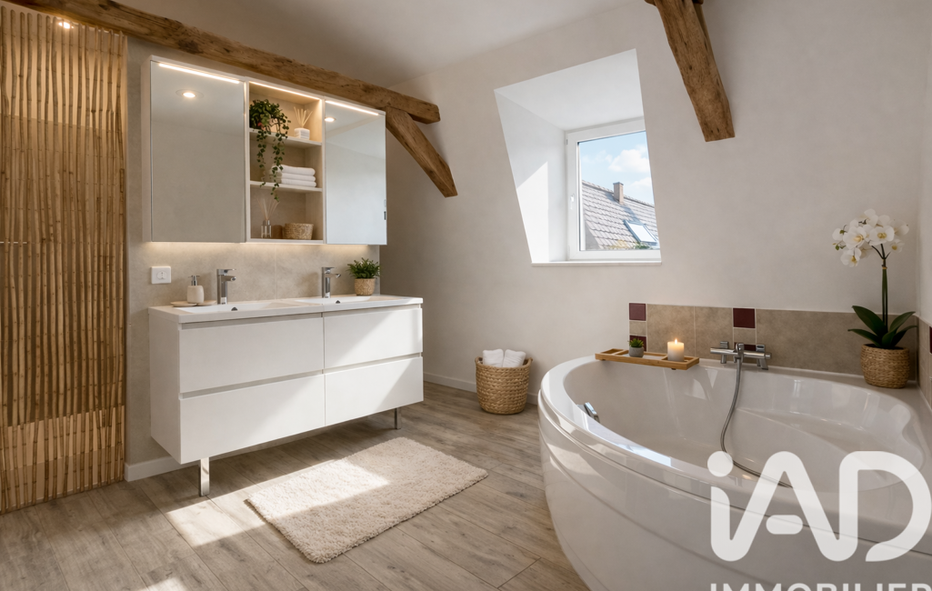 À l’étage, l’espace nuit comprend une suite parentale et une chambres en enfilade ainsi qu’une grande salle de bain équipée d’une baignoire et d’une douche.