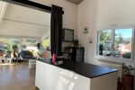 Une vaste pièce de vie baignée de lumière, orientée Est / Sud-Ouest, comprenant salon, salle à manger et cuisine américaine ouverte sur la terrasse et la piscine.