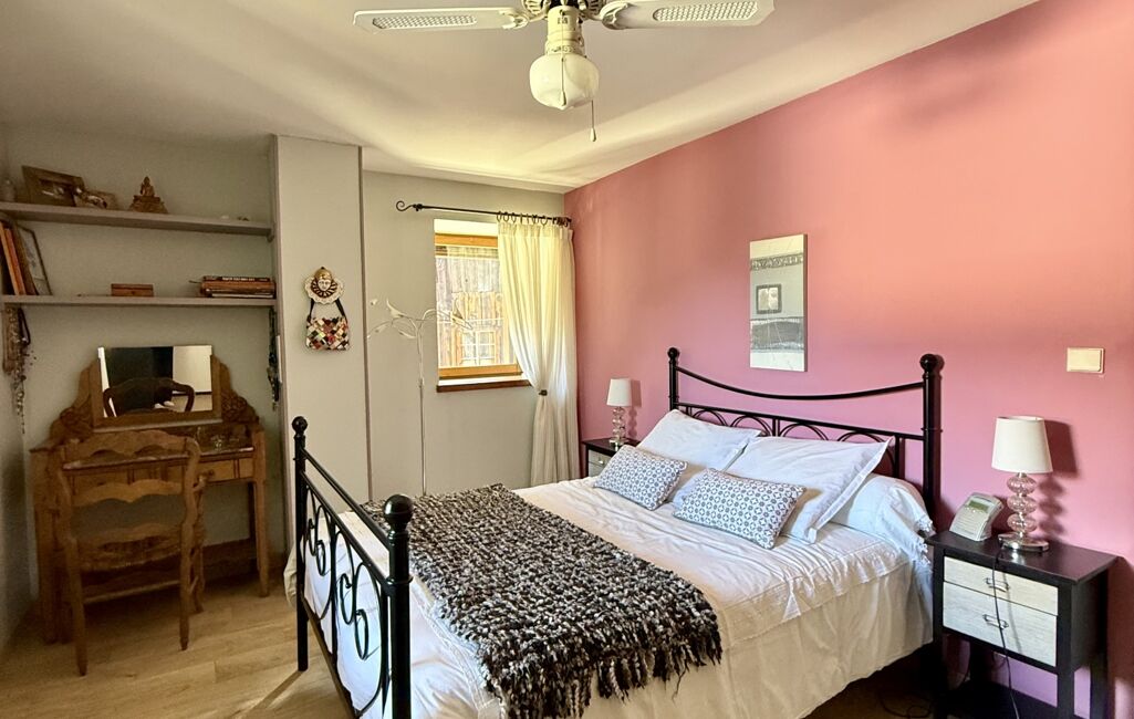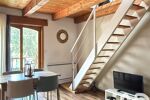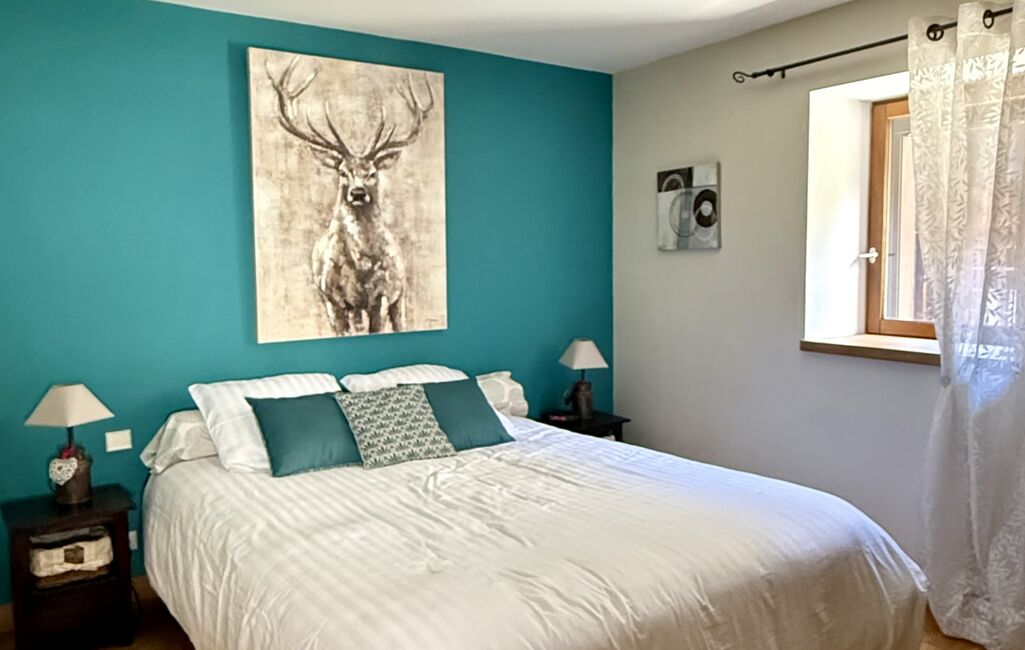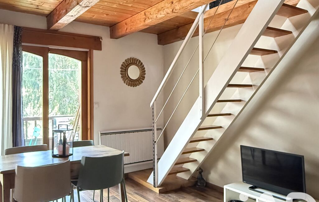 L’appartement indépendant, d’environ 54 m², dispose de sa propre entrée et constitue un véritable atout. Il se compose d’une pièce de vie avec poêle à bois, donnant accès à un balcon avec vue dégagée sur les montagnes, d’une kitchenette équipée et meublée, d’une salle d’eau avec WC et espace buanderie. À l’étage, une grande chambre en mezzanine offre un espace nuit cosy et chaleureux.