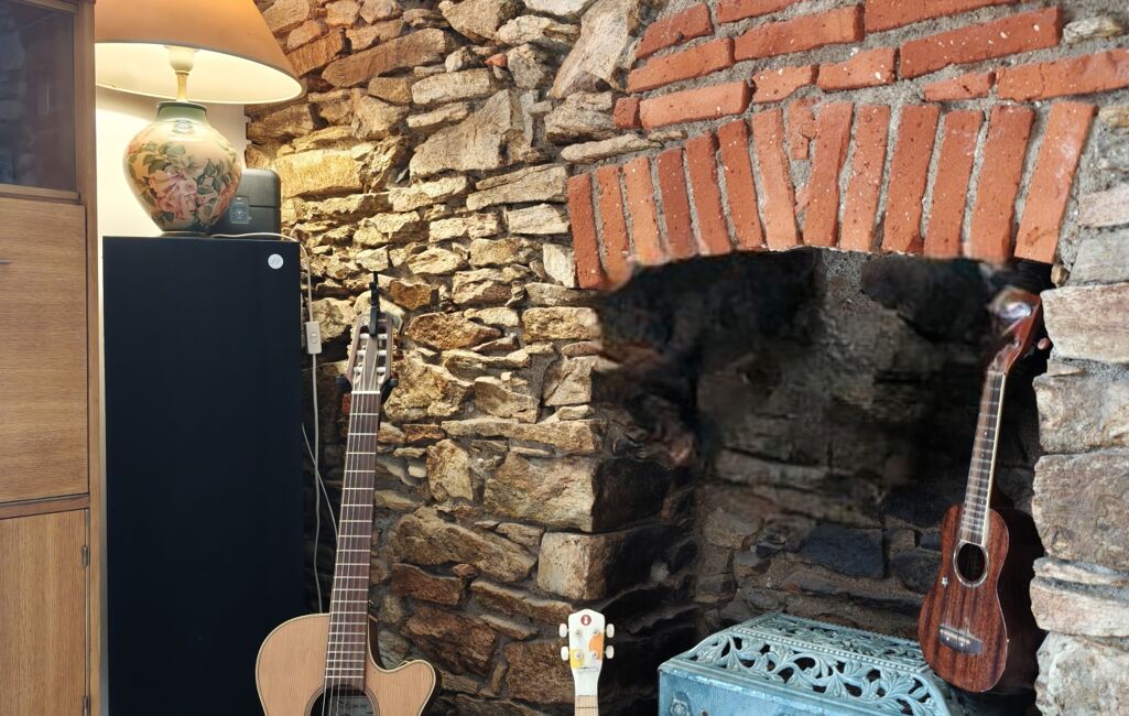 - Grande pièce de vie lumineuse avec mur en pierres apparentes.