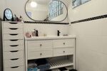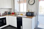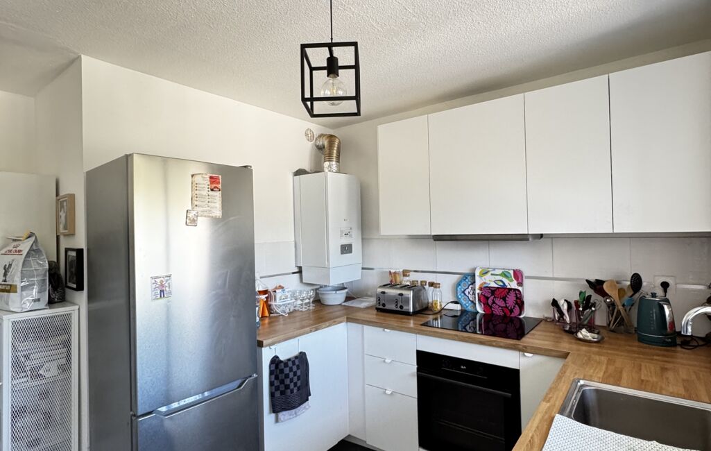 La cuisine est équipée avec des éléments de qualité, le sol en carrelage façon ardoise ajoute une touche chaleureuse à l'ensemble.