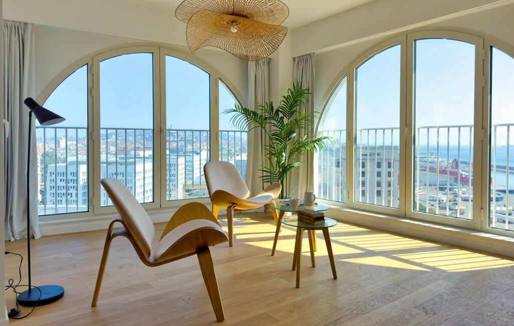 Niché à l'avant-dernier étage d'un immeuble contemporain, il vous offre une vue panoramique spectaculaire sur la rade de Marseille et la Méditerranée (îles du Frioul et du Château d'If).