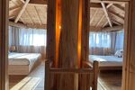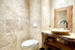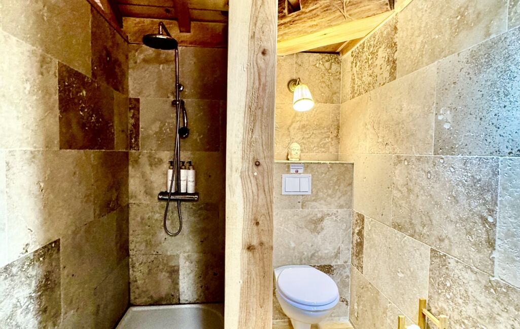 •Sol en pierre de travertin, murs en cèdre rouge, ambiance chaleureuse et naturelle