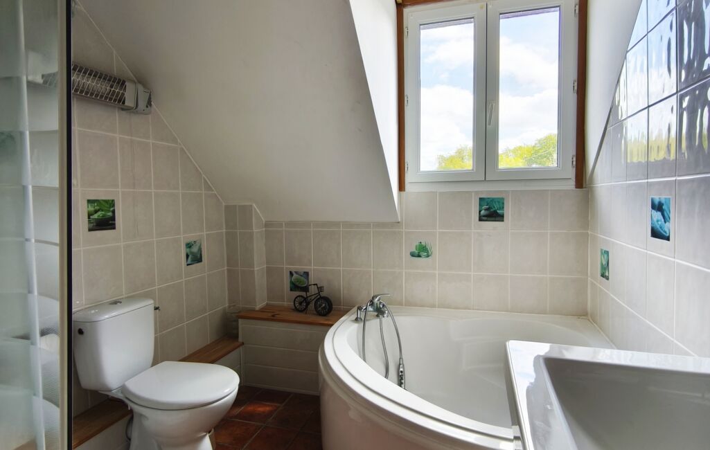 Au 1 er étage, vous arriverez sur un palier avec un espace pouvant être aménagé en bureau, une salle de bain avec douche, baignoire et un WC. Une grande chambre pouvant être séparée pour en créer une troisième.