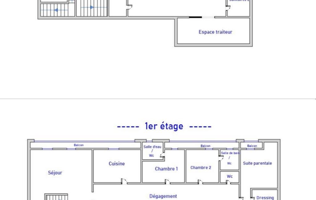 A l'étage, l'appartement comprend séjour avec cheminée insert(70m²), cuisine (20m²), dégagement vers trois chambres ( 14, 18 et 18m²) dont deux avec salle de douche et une avec salle de bains, dressing.