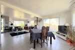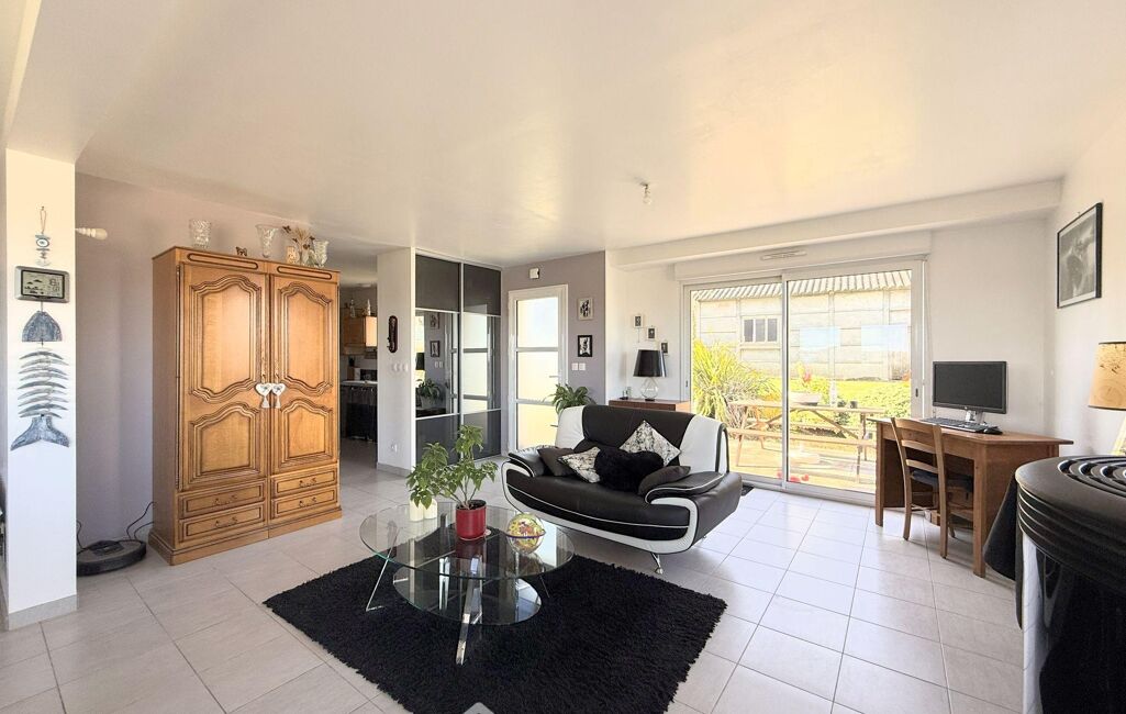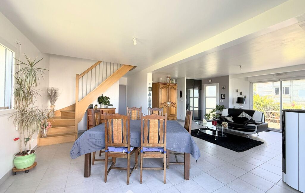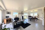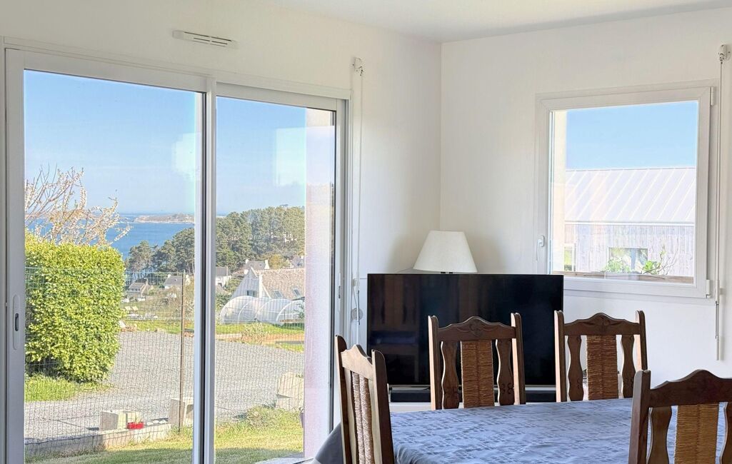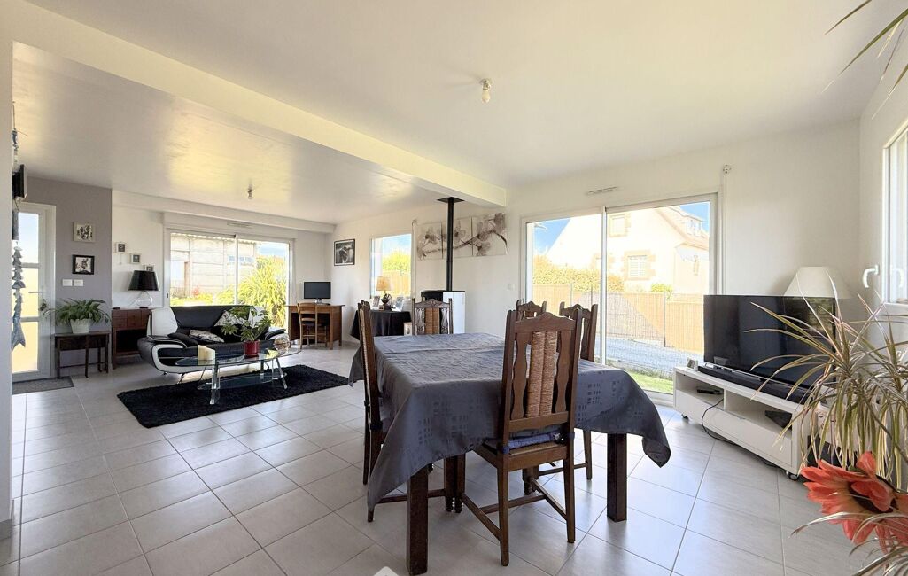 Le rez-de-chaussée de plus de 100m2, permet une vie de plain-pied, et s'ouvre sur une belle pièce de vie de 40m2 gorgée de lumière offrant une belle vue sur la mer et le bourg de Locquémeau. Le salon se poursuit par une cuisine aménagée et équipée semi-ouverte de 11m2 dont la cloison pourrait d'ailleurs être abattue sans difficulté, une buanderie de 4m2 est attenante.