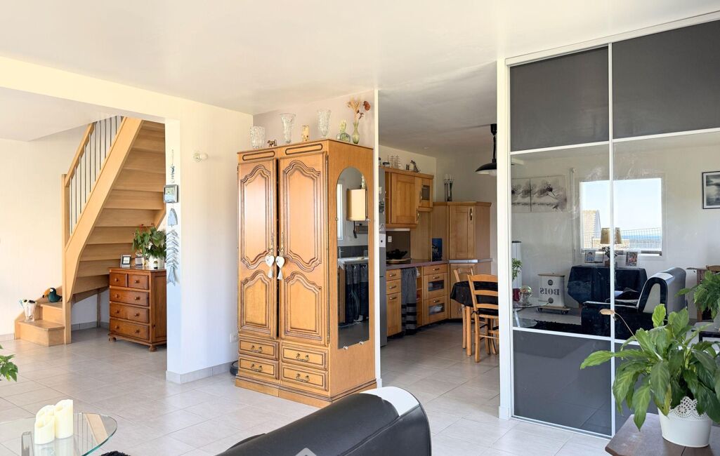 Côté extérieur, le salon se prolonge par une terrasse de 16m2 côté sud et un jardin avec davantage de vue mer côté nord. Sur cette parcelle de 674m2, la propriété possède un puits et une dépendance de type hangar de 38m2.