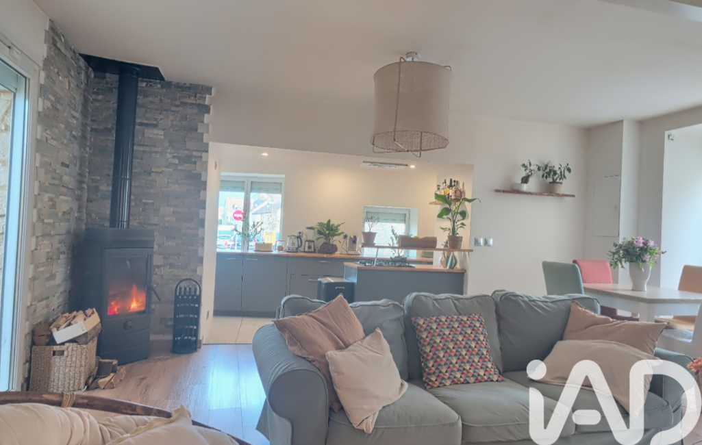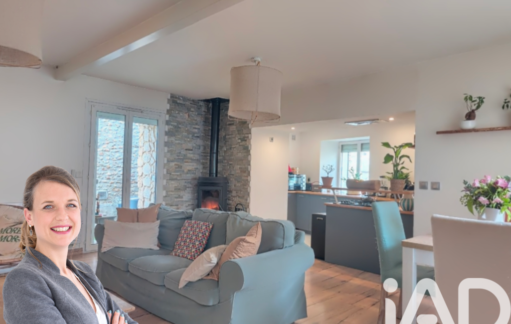 Cette maison propose une entrée, une belle pièce à vivre chaleureuse avec son poêle à bois, une cuisine ouverte et un WC.