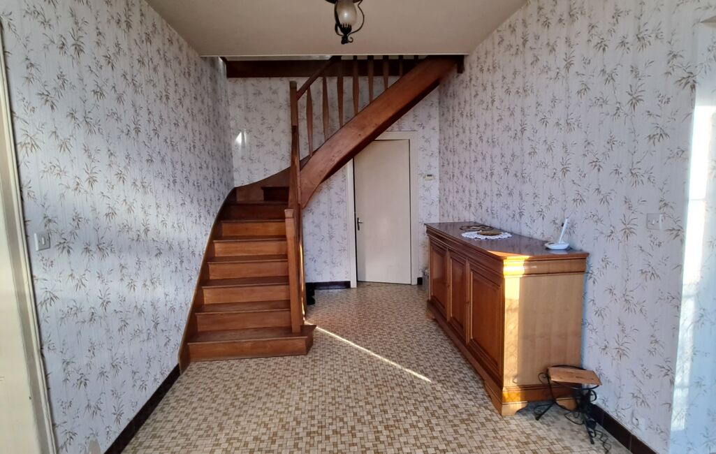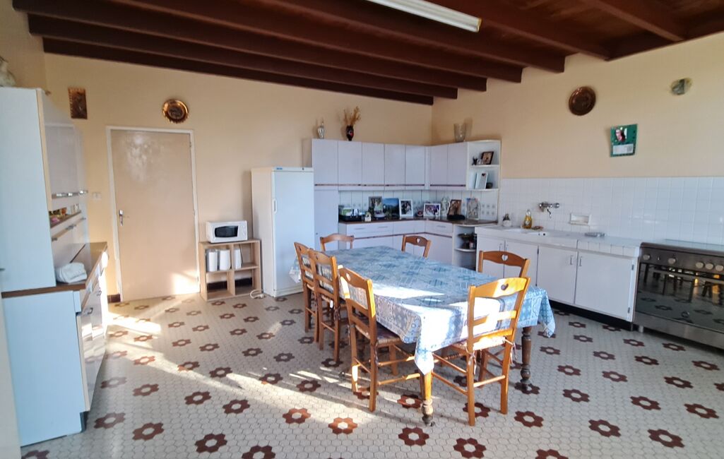 En rez-de-chaussée: une spacieuse entrée lumineuse, une vaste cuisine aménagée de 30m² , un séjour salon avec une cheminée insert et de belles poutres apparentes donne un caractère à cette maison , une buanderie, chaufferie et un WC indépendant.